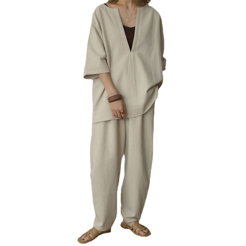 2色 無地 Vネック ツーピースセット 都会 ゆったり カジュアル パンツ セット